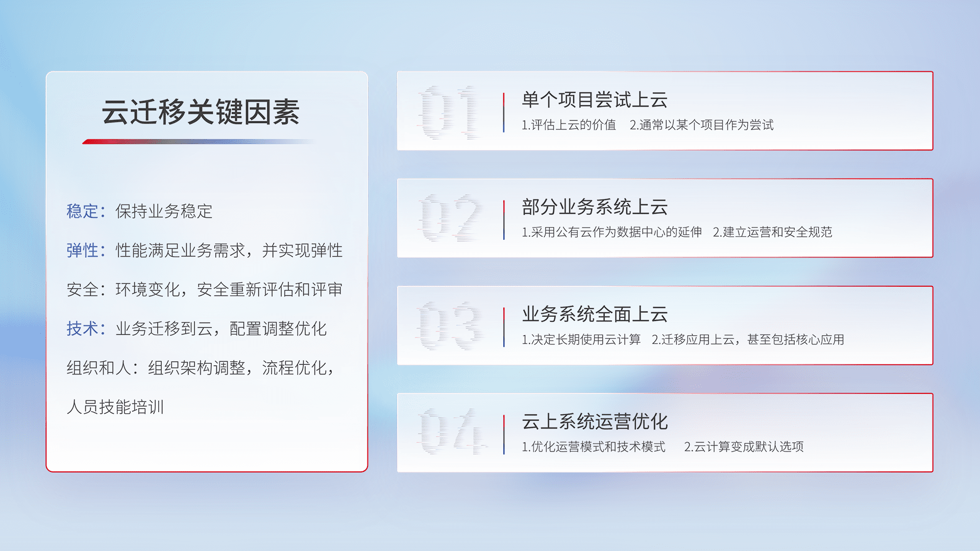 结合实际业务,,,,从规划设计、、、云平台选型、、云原生改造、、、数据迁移、、、、集成交付,,,迁移全过程为客户识别最佳上云路径,,,做好风险识别管理,,,,设计网络架构、、、、身份权限、、、安全审计合规、、操作审计、、、日志审计、、监控告警策略、、、、多站点容灾设计等,,,对云上基础设施进行整体规划,,,,提升IT治理水平,,,,以满足弹性、、、高可用、、高性能的需求。。